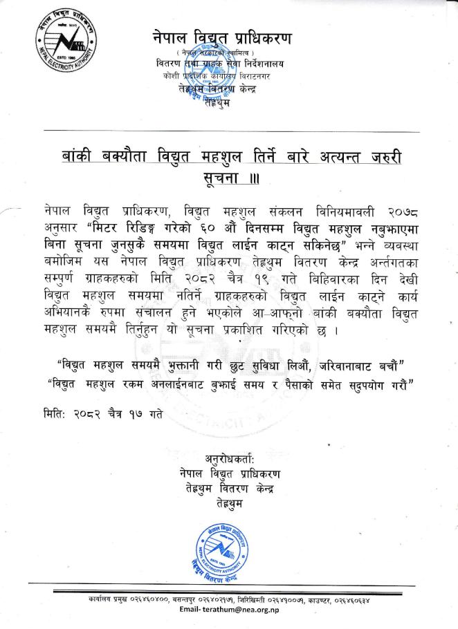 » बाँकी बक्यौता विद्युत महसुल भुक्तानी गर्ने सम्बन्धी सूचना