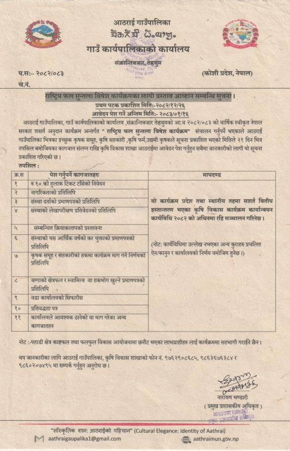 राष्ट्रिय फल सुन्तला विशेष कार्यकर्मका लागि प्रस्ताव आह्वान सम्बन्धी सूचना
