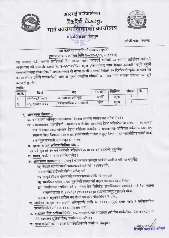 सेवा करारमा पदपूर्ति गर्ने सम्बन्धी सूचना पदः जनस्वास्थ्य अधिकृत (अधिकृतस्तर सातौं) पदः मनोसामाजिक परामर्शकर्ता (सहायकस्तर पाँचौं)