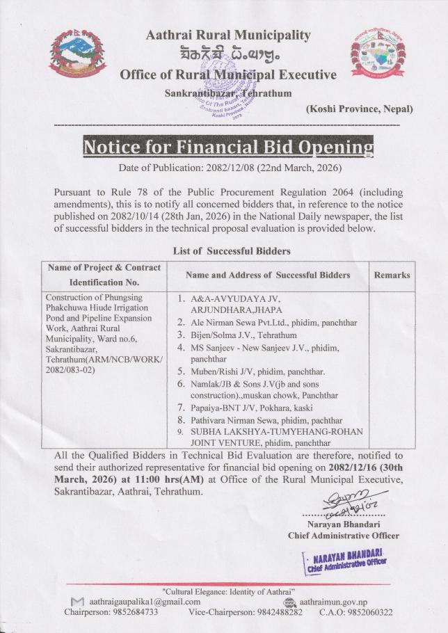 Notice for Financial Bid Opening Construction of Phungsing-Phakchuwa Hiude Irrigation Pond and Pipeline Expansion