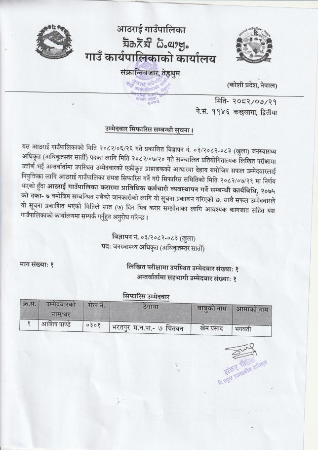 जनस्वास्थ्य अधिकृत (अधिकृतस्तर सातौं) पदको उम्मेदवार सिफारिस गरिएको सम्बन्धी सूचना