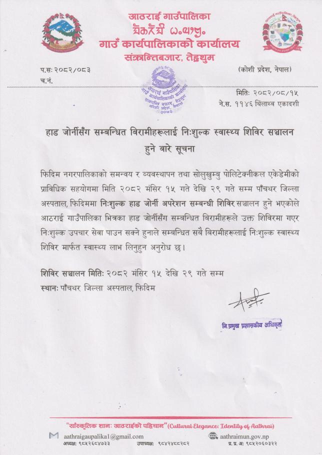 » हाड जोर्नीसँग सम्बन्धित बिरामीहरूलाई निःशुल्क स्वास्थ्य शिविर सञ्चालन हुने बारे सूचना