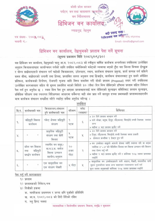 डिभिजन वन कार्यालय, तेह्रथुमको प्रस्ताव पेश गर्ने सम्बन्धी सूचना